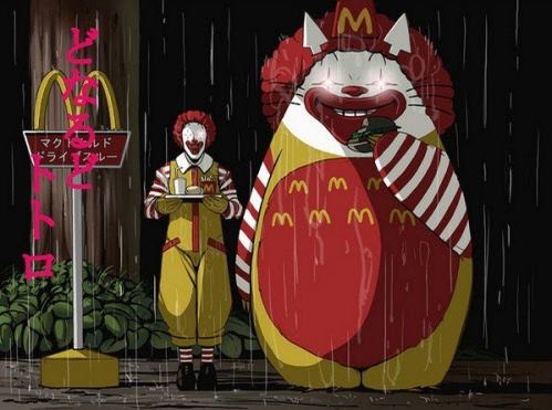 宮崎駿經典之作《龍貓》中(Totoro)是許多六年級的童年回憶,不過,在網路上卻出現惡搞的版本,不但有神奇寶貝版、海賊王版和死神版等,其中麥當勞版似乎把豆豆龍變邪惡了,讓網友大呼「麥當勞叔叔,把我的龍貓還來」。